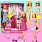 With Barbie doll, plus clothes and accessories for 4 complete looks in this fashion pack, imaginations have 4 times the inspiration to explore storytelling and style! The outfits for Barbie doll feature trendy dresses that cover all occasions, like a floral and striped dress for daytime stories and a sparkly pink party dress for nighttime soirees. Accessories include 4 pairs of shoes, 4 purses and a cool pair of blue circle sunglasses. Young stylists can mix and match the clothes and accessories to create unique looks for Barbie doll and explore their own style, too!