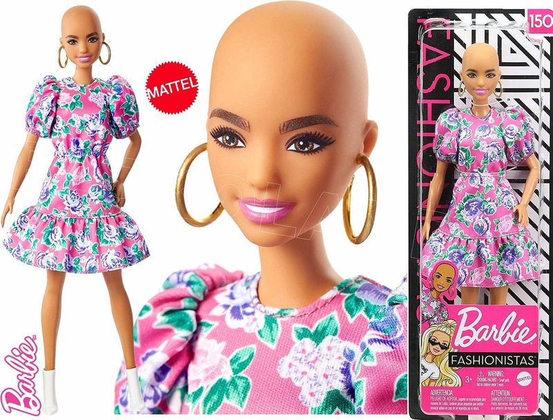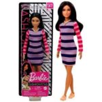 Barbie doll has a smaller bust than the original body and wears a colorful striped dress.