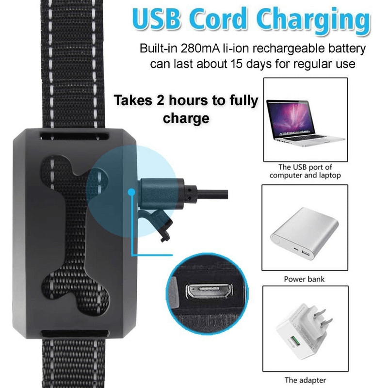 2?? RECHARGEABLE And RAINPROOF: Built-in USB rechargeable battery, lasting about 14 days to solve the issue of batteries replaced frequently. Rainproof in rain, but not in water. Adjustable anti-bark collar.