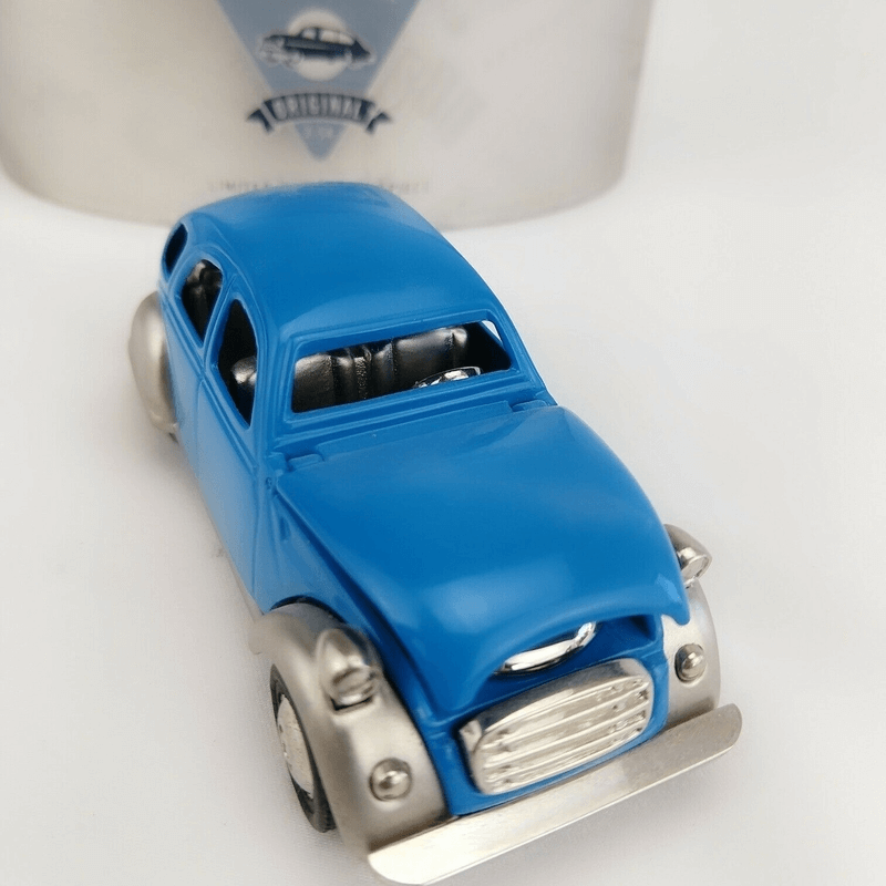 Featuring die cast metal construction with bright blue finish, rubber wheels that roll and a quality quartz clock tucked in car’s front door.
