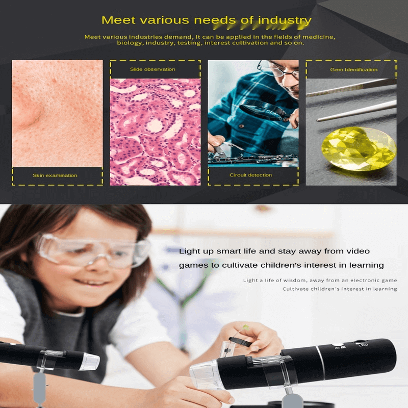 8pcs of built-in LED lights, 2 digital microscope adjustment knob can change focus and brightness