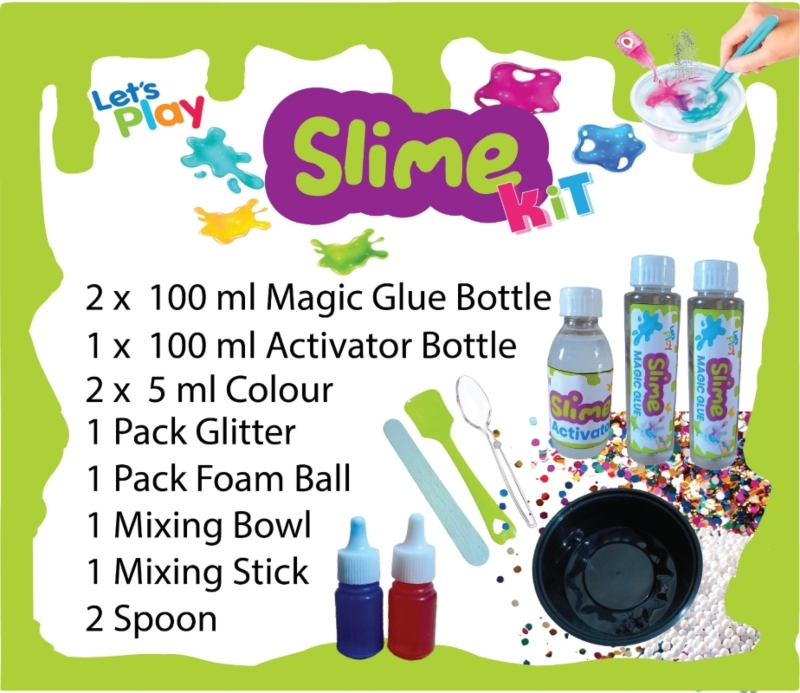 The kit contains all the required slimee supplies ? activators (Borax), glues, glitter, neon colour etc. –