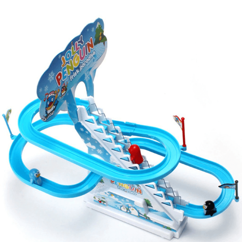 Now with music ON/OFF switch! 3 Jolly Penguins climb the stairs and joyfully slide down the slope. Mesmerizing fun!!!with flashing LED lights! Easy assembly, cute penguins, fun track, and cheerful music